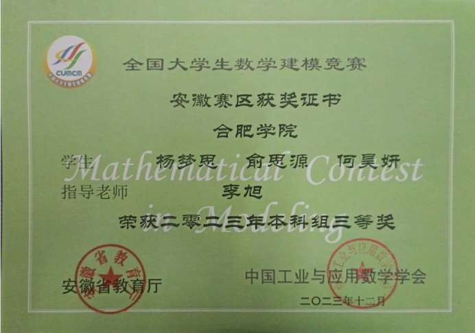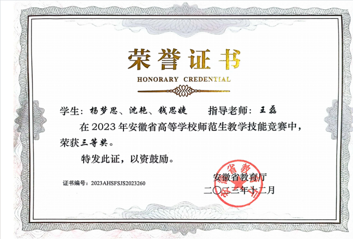 “自古圣賢之言學也,咸以躬行實踐為先,識見言論次之。”優異的成績不是終點,而是探索知識廣度與深度的起點,實踐環節更是檢驗知識的熔爐,各類學科競賽便是楊夢思探索的第一步。在數學競賽中鞏固專業知識,了解細分的研究方向,在建模競賽中鍛煉合作意識與解決問題的能力,學會尊重和包容他人的不同意見,在師范生技能競賽中提升授課水平,積累教學經驗。她獲得了第九屆“田家炳杯”全國師范院校師范生教學技能競賽三等獎,安徽省高等學校師范生教學技能競賽三等獎,全國大學生數學建模競賽安徽賽區本科組三等獎2023年安徽省大學生市場調查與分析大賽本科組二等獎,校級獎項數項。在合肥一中實習期間擔任實習老師,全方位配合指導老師,迅速上手各項工作,深入研究教材內容,依據自己的知識體系,針對教學目標的確定、重難點的把握積極出謀劃策,為指導老師提供有價值的參考意見,運用豐富的知識,結合生動有趣的案例,把復雜的知識簡單化,讓學生輕松理解。指導老師對其工作態度和教學能力十分贊賞,展現其良好的專業素養和潛力。