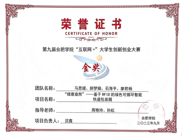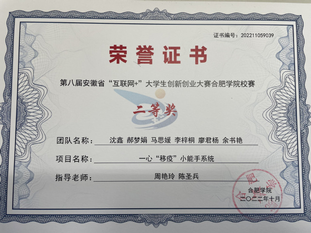 沈鑫,合肥大學人工智能與大數據學院計算機科學與技術專業2021級本科生,漢族,共青團員。曾獲國家獎學金、國家勵志獎學金、校特等獎學金、合肥大學第十九屆“榜樣學子”提名獎、“三好學生”稱號等;學科競賽中獲得國家級獎項2項,省級獎項7項,校級獎項20余項;連續三年綜測成績、學業成績位于專業第一,歷年平均成績超過90分,學位課平均學分績點4.16;專注學科前沿,圍繞計算機仿真開展研究,發表學術論文1篇(第一作者,EI檢索),授權軟件著作權3項(第一完成人);主持、參與國家級大學生創新創業訓練項目2項,省級大學生創新創業訓練項目5項;曾擔任院新聞中心副主任、校新媒體中心編輯,積極參加獻血、志愿活動等,志愿時長超150小時;實習期間擔任Web開發項目組長,負責需求解讀、產品優化、質量管控、工期控制,最終項目成功布署上線;他的事跡在校園公眾號:“合大智數青年”、“合肥大學”、“合肥大學招生辦公室”有過相關報道并取得一定反響。