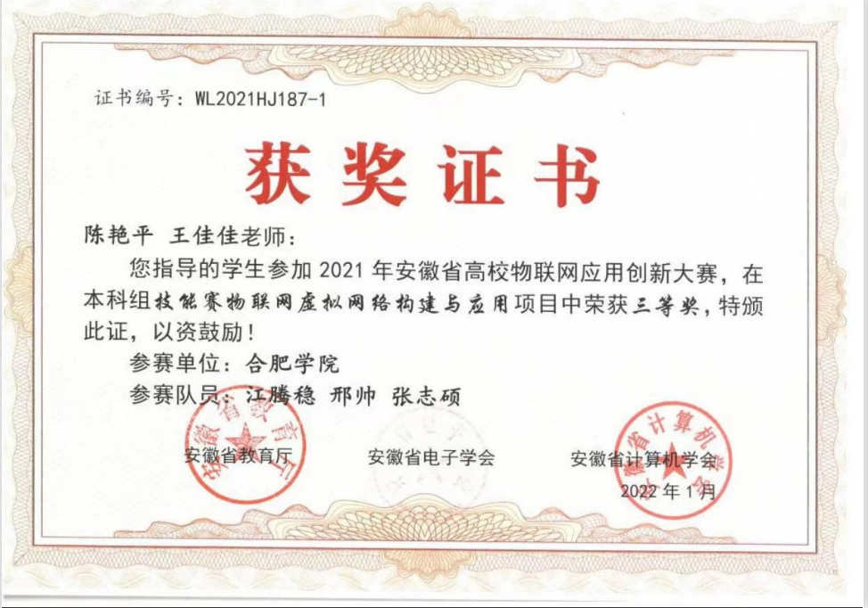 近六年在師生共同努力下,共獲得國際獎項21項、國家級獎項146項、省級獎項480項。主要獎項有:2022中國機器人大賽暨RoboCup機器人世界杯中國賽-仿真2D組冠軍;“華數杯”全國大學生數學建模競賽國家級二等獎一項,三等獎一項,優秀獎六項;第八屆東方財富杯全國大學生金融挑戰賽國家級二等獎一項;安徽省機器人大賽省三等獎四項;安徽省大學生統計建模大賽省級一等獎一項;第八屆安徽省“互聯網+”創新創業大賽省級獎;第十屆“挑戰杯·華安證券”安徽省大學生創業計劃競賽銀獎,第十二屆MathorCup高校數學建模挑戰賽二等獎等;獲批大學生創新創業訓練計劃項目國家級97項,省級175項,先后有2人次學生獲得安徽省“創新之星”榮譽稱號。