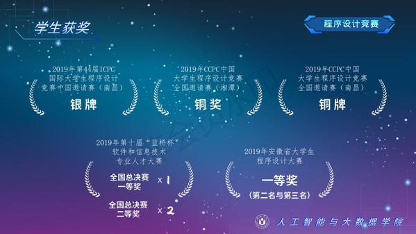 人工智能與大數據學院緊緊圍繞學校人才培養中心工作,2012年以來積極開展以學生科技創新創業為主的第二課堂工作,以學生“能力水平、專業類別和興趣愛好”為根本出發點,目前成立了: RoboCup機器人足球、數學建模、AR/VR團隊、物聯網創新設計、移動應用開發、ACM-ICPC算法設計、仿人機器人、水下機器人、區塊鏈、網絡與信息安全等16支團隊,并且專門建設了機器視覺應用、數學建模與仿真等6個學生創新實驗室、移動APP開發、多智能體系統、數據分析與仿真等8個大學生創客中心;為各團隊提供良好的環境和資源。通過這些工作的開展,人工智能與大數據學院大學生的創新創業能力逐步增強,目前有200余人常駐創新創業實驗室。近五年在師生共同努力下,在各類競賽中共獲獎800項,其中國際級21項,國家級獎項160余項、省級獎項600余項。RoboCup機器人2D仿真足球隊連續5次進入世界杯前8強,先后獲得葡萄牙公開賽冠軍、世界杯季軍等國際獎項,是世界杯、中國機器人足球賽公認強隊;此外獲得中國機器人大賽暨RoboCup公開賽曾獲得國家特等獎1項、美國大學生數學建模競賽獲得國際二等獎6項,全國大學生數學建模競賽獲得國家二等獎1項,CCPC中國大學生程序設計競賽總決賽銀牌,Robocup機器人世界杯中國賽獲得亞軍,“哈工大杯”第十六屆全國機器人錦標賽暨“博思威龍杯”第五屆國際仿人機器人奧林匹克大賽獲得國家一等獎2項,“藍橋杯”全國軟件和信息技術專業人才大賽個人賽曾獲得國家一等獎2項,“田家炳杯”第六屆全國師范院校師范生教學技能競賽國家二等獎、第二屆全國師范生微課設計大賽國家特等獎等。獲批大學生創新創業訓練計劃項目國家級86項,省級168項,獲批大學生創客實驗室項目8項,2名優秀學生獲得安徽省“創新之星”榮譽稱號。