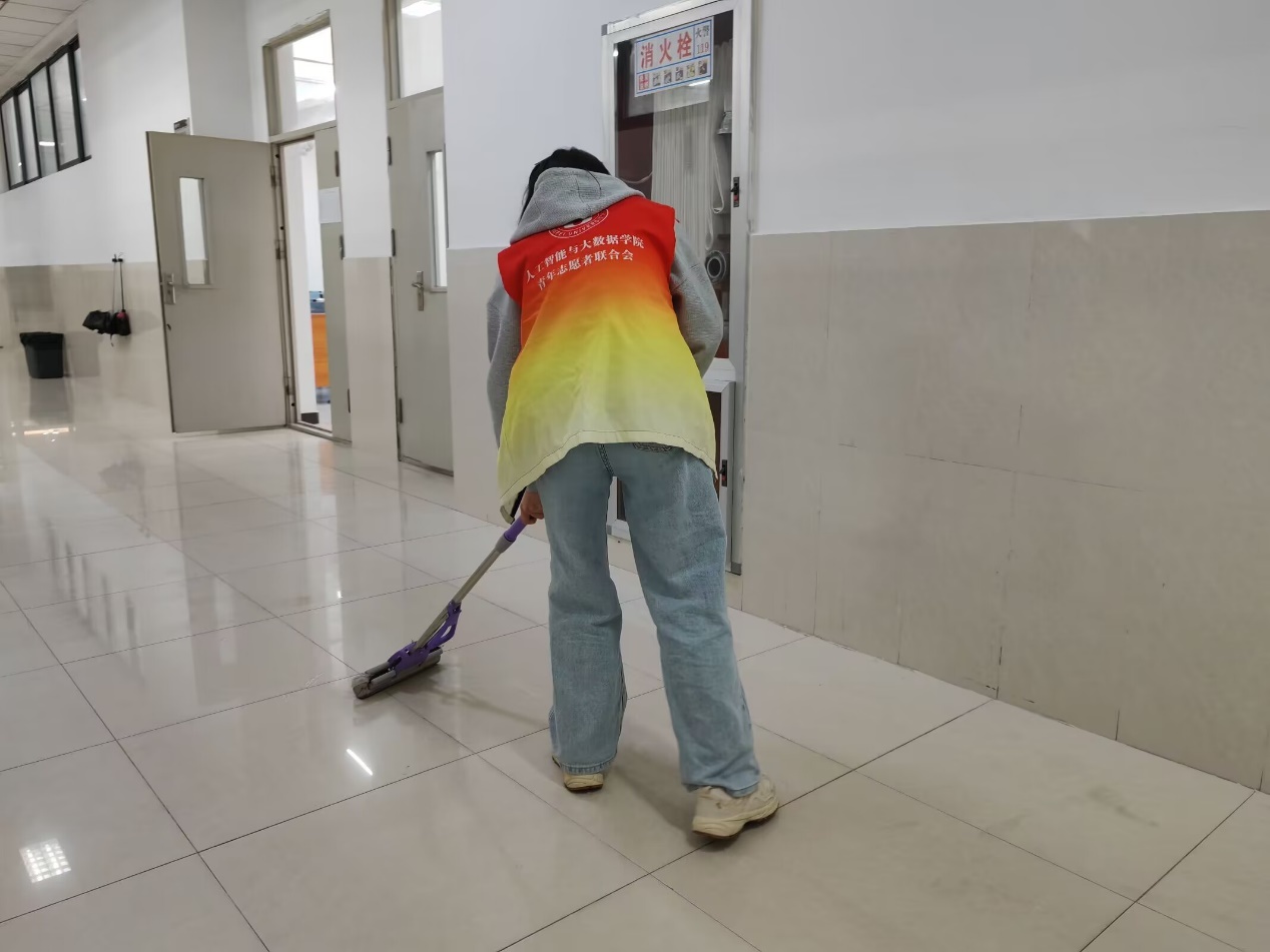 志愿者們手持掃把、拖把、清潔劑等工具,分工明確,有的負責用掃帚清掃地面,有的負責使用拖把拖地,還有的負責整理講桌。志愿者的行動迅速而有序,確保了教學樓的每一個角落都變得更加干凈明亮。