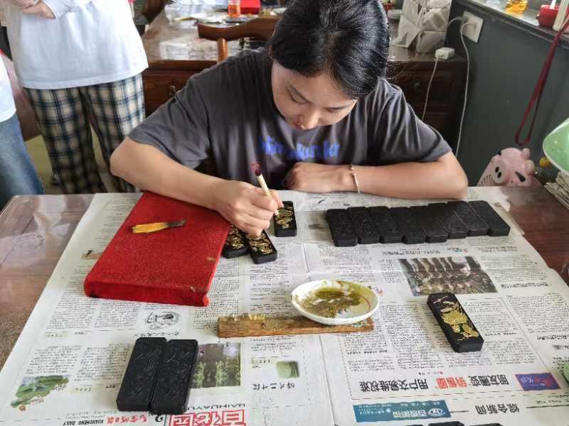 在這里,我們深入了解徽墨從選材到成品的每一道工序,親手體驗制墨的精湛技藝,感受傳統(tǒng)手工藝人的執(zhí)著與堅持。視頻組的同學利用相機記錄下徽墨制作的全過程,從煉煙的細膩,到和膠的精準,再到杵搗的辛勤,再到銼邊、描金,剪輯成視頻,致力于宣傳匠人的心血與智慧和對于完美的追求與執(zhí)著,也為宣傳和傳承傳統(tǒng)文化。