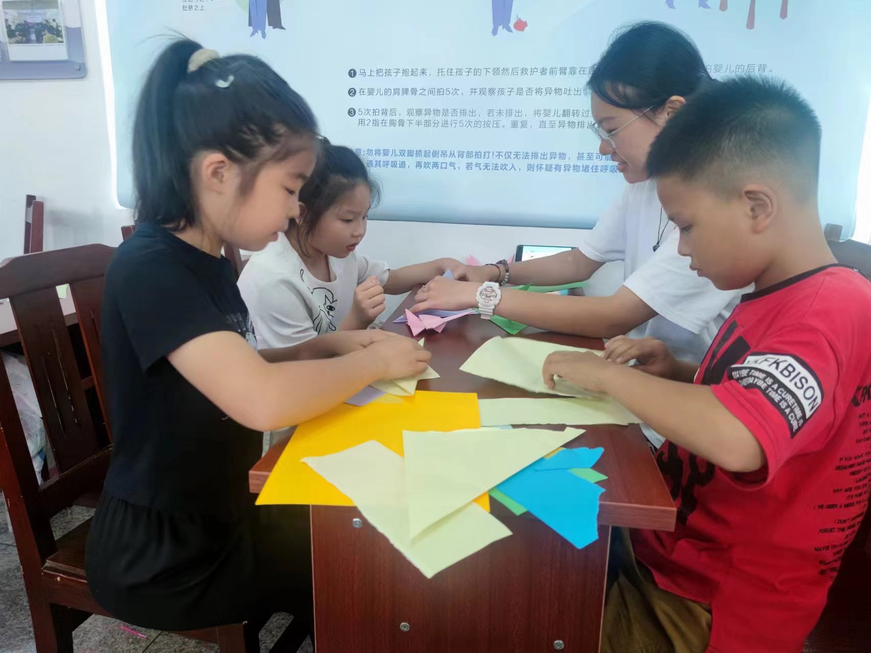 718日上午,同學們又去往五龍社區(qū)開展垃圾分類主題的公益課堂。同學們耐心地指導每一個孩子進行折紙,豐富了兒童的課余生活。