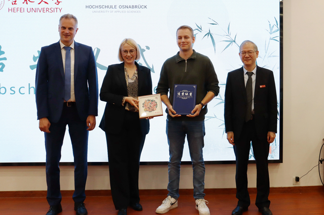 隨后,雙方來到設計學院參加德國學生徽文化秋令營結業儀式。儀式在活動回顧短片中開場,短片展示了德國學生在合肥大學交流期間豐富多彩的學習生活,德國學生深度體驗舞龍舞獅、中國功夫、針灸推拿、書法、飲茶等多種不同的中華傳統文化,深刻體現了中華文化的魅力。王其東書記代表學校對卡塔琳娜·普特市長一行表示熱烈的歡迎,對徽文化秋令營的成功舉辦表示祝賀,他表示德國同學在短短一周內同中國學生建立起深厚情誼,為日后攜手書寫兩校友誼新篇章打下堅實基礎,此次交流為雙方未來教育、經濟、文化發展注入了生機與活力。奧斯納布呂克應用科學科學大學校長亞歷山大·施梅曼先生在致辭中感嘆中國發展速度之快,同時也很高興看到合肥大學的高速發展變化,希望有更多形式的交流活動能夠加深兩校友誼,深化合作與發展。德國奧斯納布呂克應用科學科學大學的學生代表伊爾薩比·拉德馬赫發言,她向大家分享了她在合肥大學交流期間新奇的體驗與感悟,并表示會記住這段美好回憶。