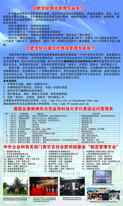 會上,蔡院長說,我院與德國首次開展共建物流管理專業(yè)合作項(xiàng)目,針對該專業(yè)招生情況,我院專門召開了一次新聞發(fā)布會,并開始面向全國招生,同時也希望德國奧斯納布呂克應(yīng)用科學(xué)大學(xué)加大宣傳力度,以保證本專業(yè)在德國的生源。他強(qiáng)調(diào),教師培訓(xùn)計(jì)劃即將啟動,我院會逐步組織物流管理專業(yè)教師赴德學(xué)習(xí),以適應(yīng)模塊化教學(xué)方式,國際教育學(xué)院副院長徐剛將擔(dān)任對話聯(lián)絡(luò)人,保持與德國高校的密切聯(lián)系,確保“國內(nèi)留學(xué)、共同培養(yǎng)”辦學(xué)模式的順利實(shí)施和物流管理專業(yè)合作項(xiàng)目的順利開展。我院高度重視物流管理專業(yè)的開展情況,去年,學(xué)院已向中央財(cái)政申請200萬資金用于實(shí)驗(yàn)室建設(shè),今年將再申請150萬加強(qiáng)建設(shè)。目前,項(xiàng)目進(jìn)行得非常順利,相信在雙方的共同努力下,物流管理專業(yè)教學(xué)工作將會開展得更好。